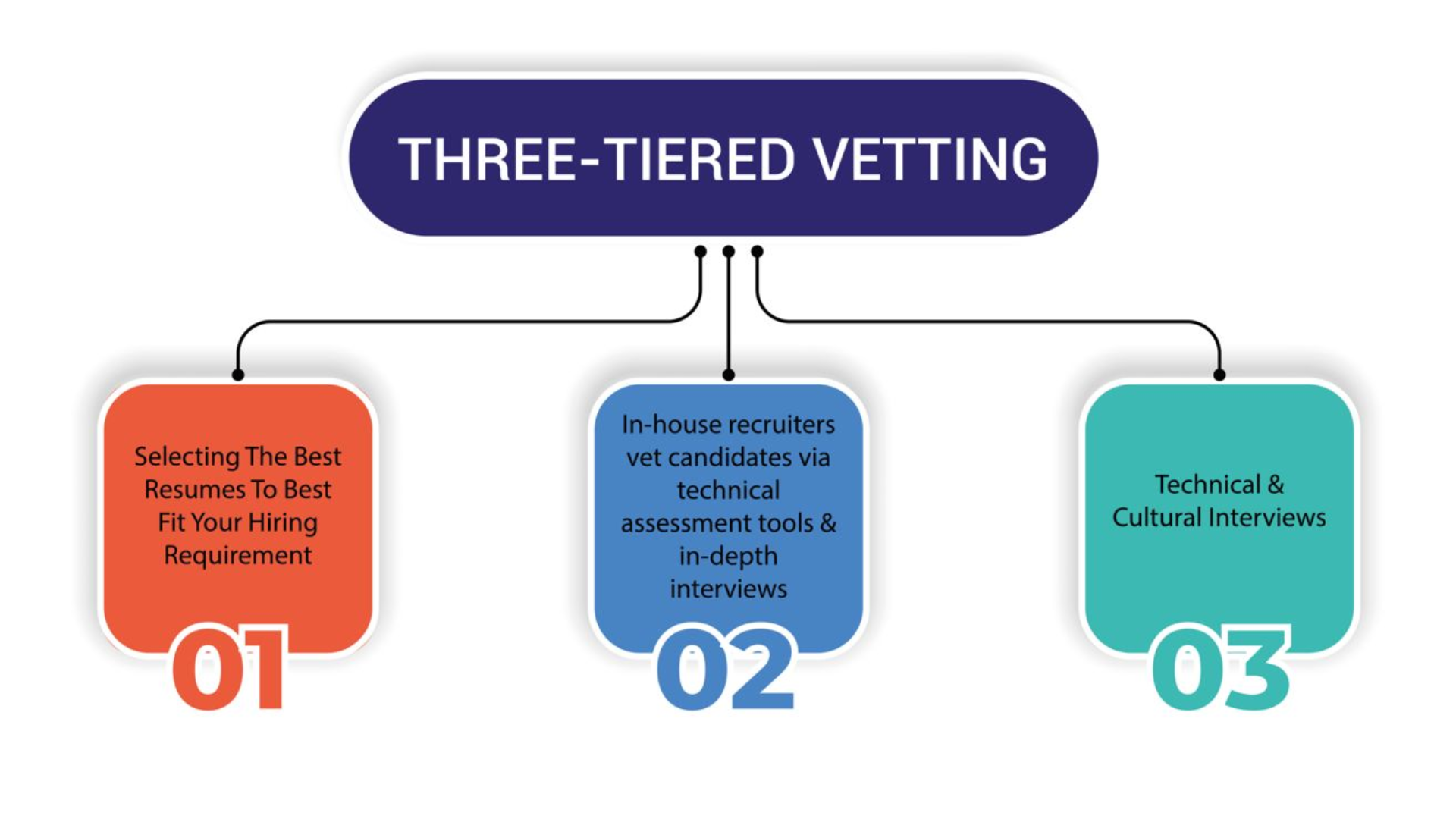 What makes us different? Every recruiter here has walked the client side of the aisle. We’ve built dev teams from scratch, closed mission-critical skill gaps mid-project, and managed P&Ls that couldn’t afford hiring mistakes. That firsthand experience fuels our Three-Tiered, AI-Powered Vetting System, ensuring only candidates who can hit the ground running ever reach your inbox.